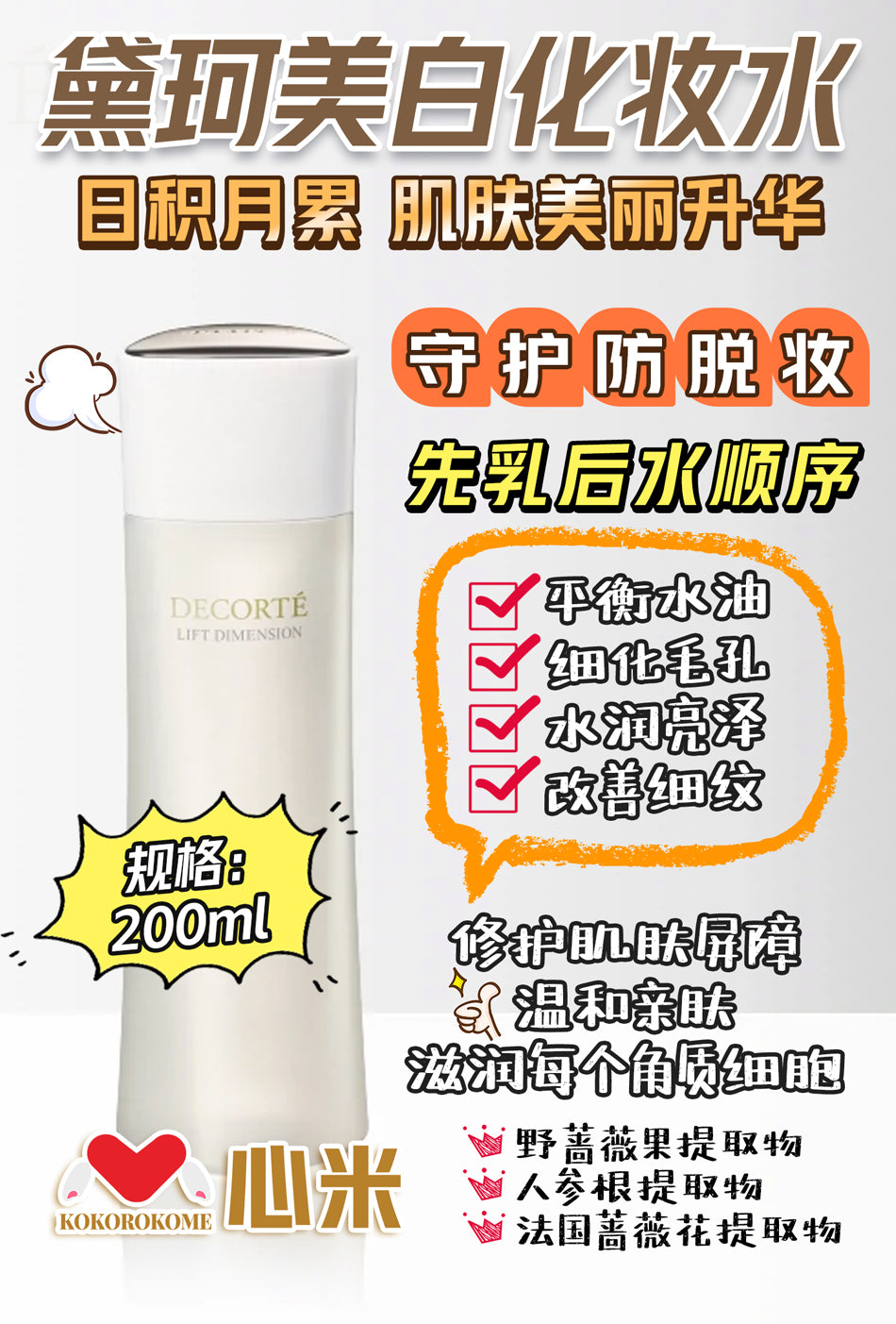 コウジ酸※、精製水、1,3-ブチレングリコール、濃グリセリン、エタノール、ジグリセリン、L-テアニン、d-δ-トコフェロール、アデノシン三リン酸二ナトリウム、エイジツエキス、カンゾウフラボノイド、コーヒーエキス、コラーゲン・トリペプチド F、センプクカエキス、チャエキス(1)、チンピエキス、ニンジンエキス、ノニ果汁、ヒアルロン酸ナトリウム(2)、ブクリョウエキス、マツエキス、ヤシャノキエキス、ロニセラカエルレア果汁、天然ビタミンE、党参抽出物加水分解液、2-エチルヘキサン酸セチル、l-メントール、エデト酸二ナトリウム、オレイルアルコール、オレイン酸エチル、オレイン酸オレイル、コハク酸、コハク酸二ナトリウム、コレステロール、ジプロピレングリコール、スクワラン、ソルビット液、タマリンドガム、ヒドロキシメトキシベンゾフェノンスルホン酸ナトリウム、ポリエチレングリコール20000、ポリオキシエチレンラウリルエーテルリン酸、メチルポリシロキサン、水素添加大豆リゾリン脂質、水素添加大豆リン脂質、無水エタノール、フェノキシエタノール、香料、カラメル\n\n※;有効成分 無印;その他の成分"